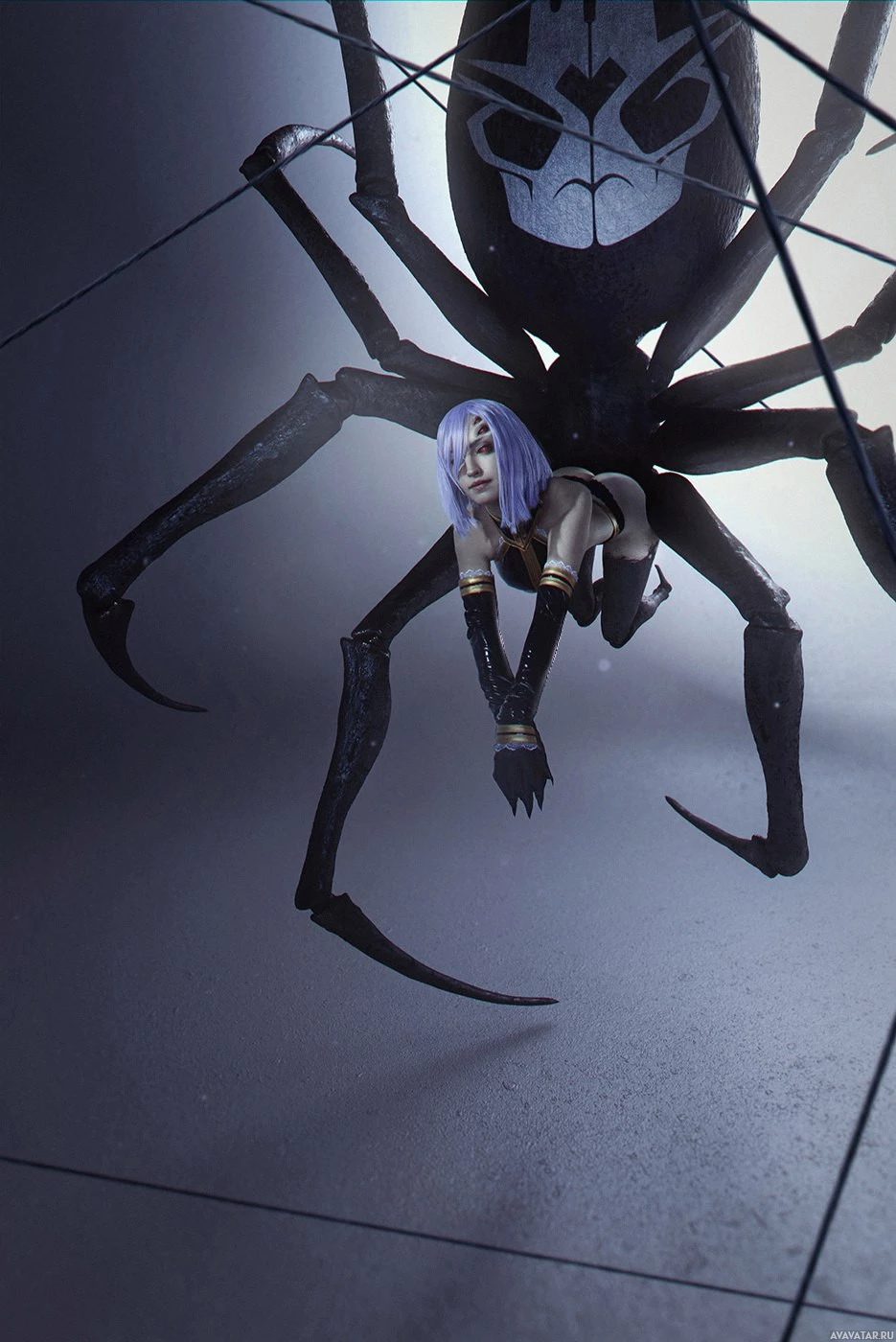 blue hair that matches the color often associated with Spider-Man's costume, and they are standing in front of a backdrop featuring spider-like silhouettes. It appears to be a staged photoshoot or