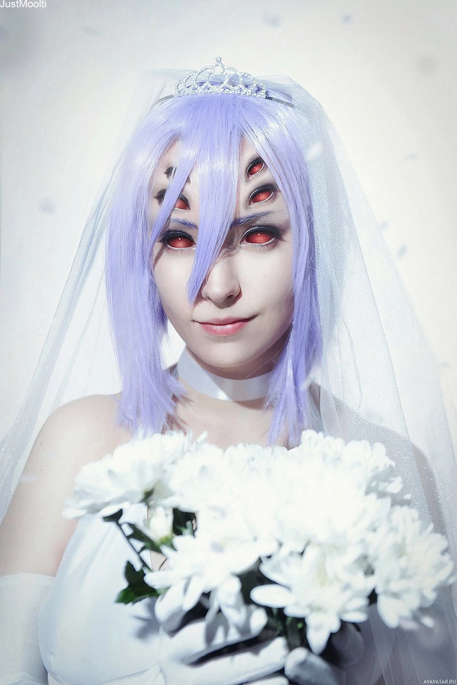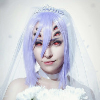 a wedding gown and a bouquet of flowers in one hand, suggesting a wedding theme to the cosplay. There are also white