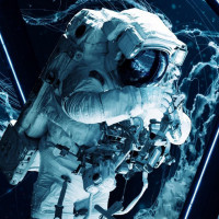 a space suit floating in a weightless environment. The background is dark, possibly simulating the void of
