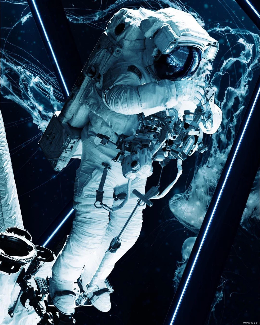 outer space, and there are reflections or streaks that might represent stars or other celestial bodies. The astronaut appears to be performing some