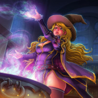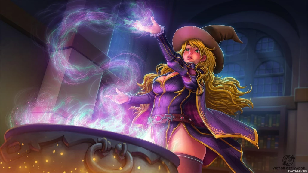 a female character who appears to be casting a spell or performing magic. She is wearing a witch's hat and has a wand in her hand, which she is using to create a visual effect that resembles smoke or