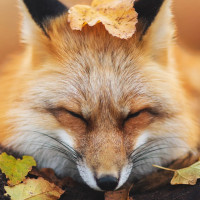 На картинке изображена лиса, лежащая среди опавших листьев, вероятно, осенью, учитывая окраску листьев. Лиса, по-видимому, отдыхает или спит с закрытыми глазами и слегка открытым ртом. Сцена передает ощущение умиротворенности и спокойствия.