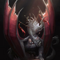 The image features a fantasy-themed illustration of a dragon. It has a prominent and detailed design, showcasing the creature's red scales and