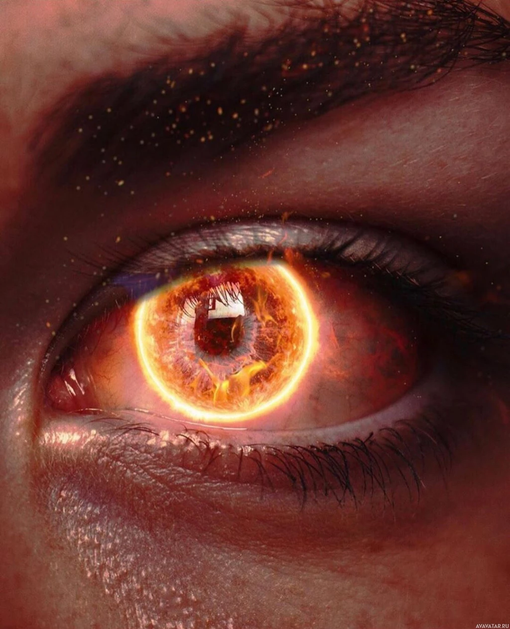 surrounding area appears to be on fire, with sparks flying around the eye, which may symbolize intense emotion or danger.