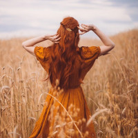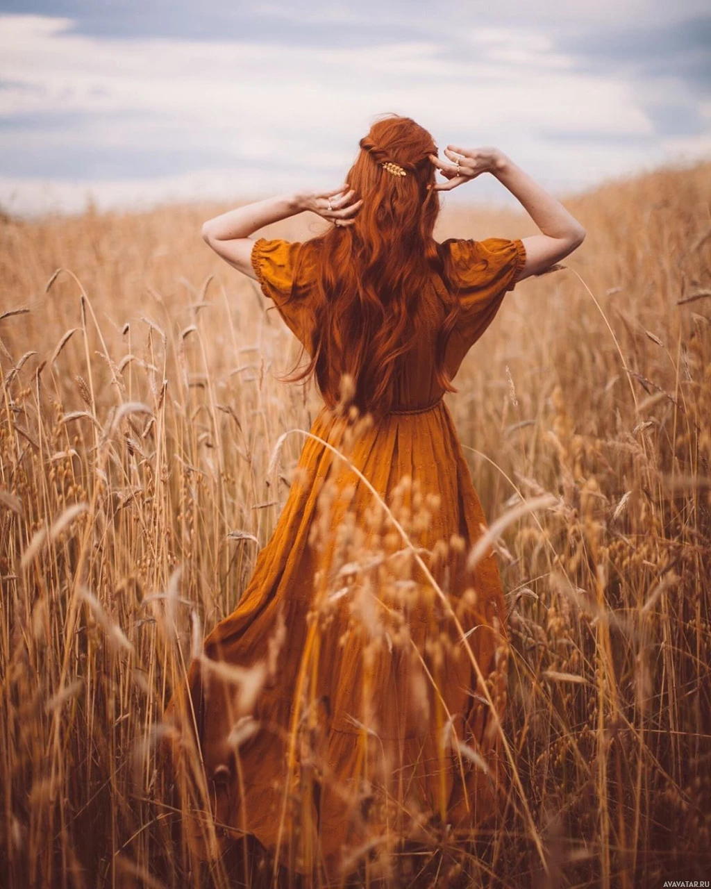 a long dress and has her hands placed on either side of her head, as if she's touching it or adjusting something. The background shows tall, golden-colored wheat or grain, which suggests that the photo might have been taken during