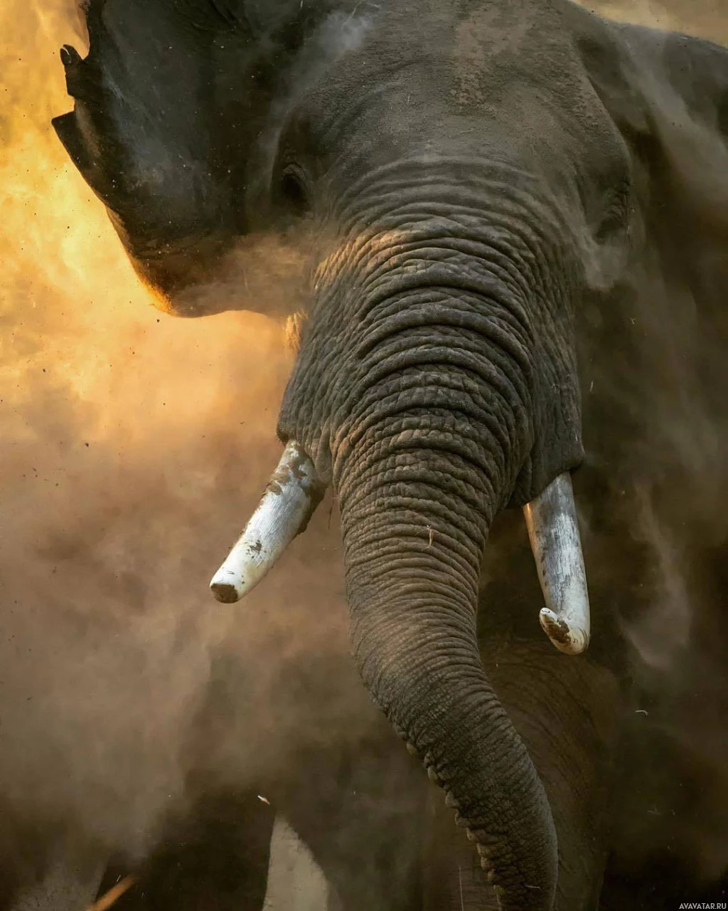 На снимке изображен слон в движении, возможно, бег или зарядка. Пыль поднимается движением ног и бивней слона, что указывает на то, что она может быть на грунтовом поле или аналогичной местности. Похоже, что он запечатлен в середине движения при дневном свете с драматическими световыми эффектами из-за угла солнца.