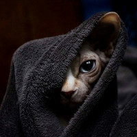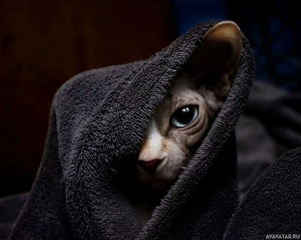 На картинке изображен кот, завернутый в то, что кажется одеялом или полотенцем. Глаза кошки видны и кажутся любопытными или слегка неудобными с ситуацией, учитывая ее внимательное выражение.