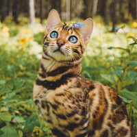 На картинке изображен бенгальский кот, сидящий на вершине пня дерева, окруженный зеленой листвой. У кошки отличительные глаза с зрачками, которые имеют расширенный и синий цвет, что является общей чертой среди бенгальских кошек из-за их уникального генетического состава. Кажется, что он смотрит в сторону камеры или ее окружения с внимательным выражением.