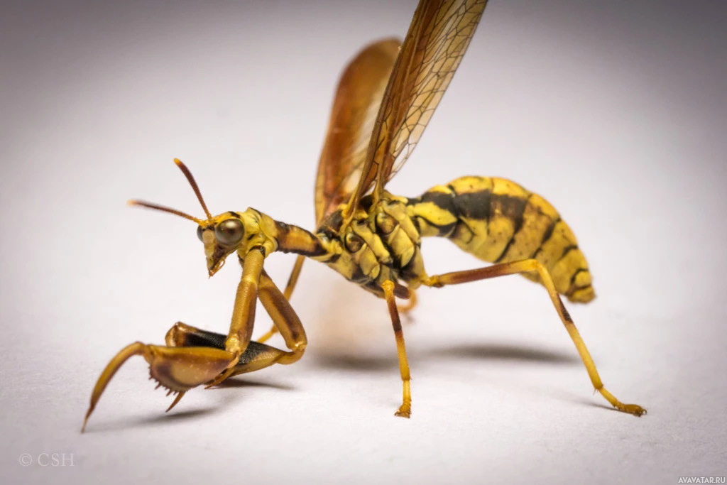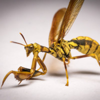 The image shows an insect, specifically a mantis, which is known for its distinctive appearance with yellow and black markings. Mantids are known for their unique
