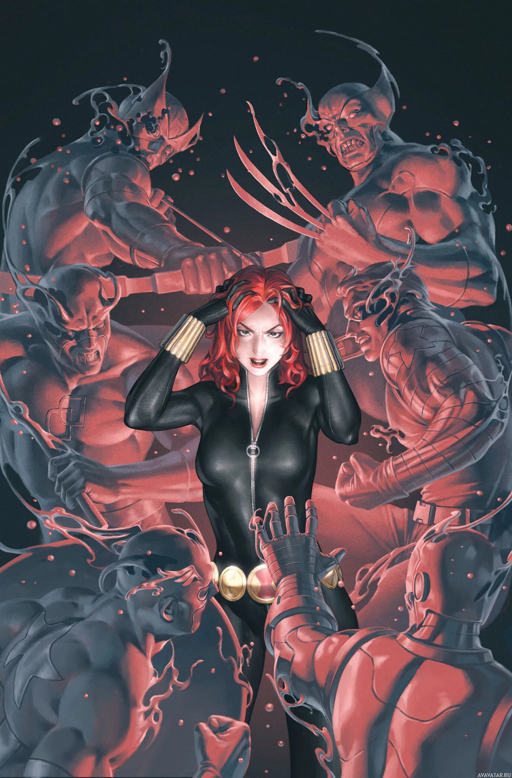 a chaotic scene with multiple figures that appear to be her adversaries, suggesting an action-packed narrative typical of superhero stories.