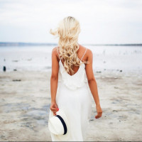 The image shows a woman walking on the beach from behind. She appears to be blonde, and she is wearing a white dress with a high neckline. She also has a straw hat in her hand. It's a cloudy day, and the beach looks empty except for her.