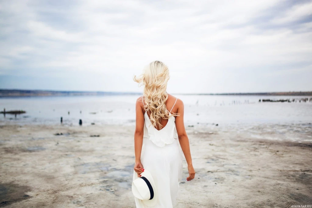 На снимке изображена женщина, идущая по пляжу сзади. Она выглядит блондинкой и носит белое платье с высоким вырезом. В руке у нее также соломенная шляпа. Сегодня облачный день, и пляж выглядит пустым, кроме нее.