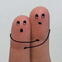 The image shows a close-up of two fingers pressed together, with each finger adorned to look like a face. The face on the left finger appears surprised or shocked, while the face on the right finger looks sad or crying. This creative depiction is often seen in doodles and illustrations meant to add an emotional or humorous touch to otherwise ordinary