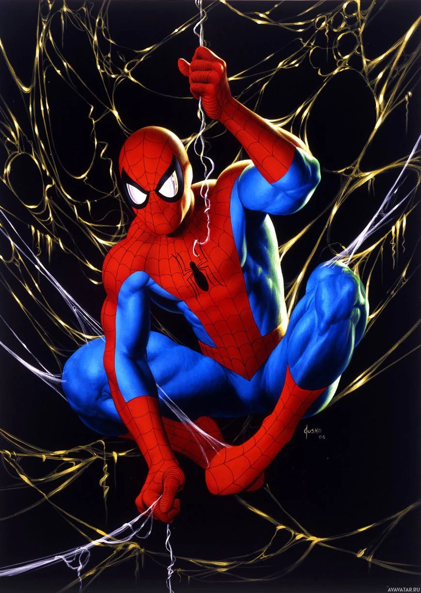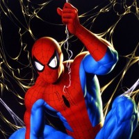 the spider emblem on his chest, crouching or kneeling amidst what appears to be an intricate web design that could be associated with his powers. The art style suggests this might be from a comic