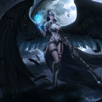 dark wings spread out behind them. They are holding a staff with a blue light emanating from it, which could be interpreted as
