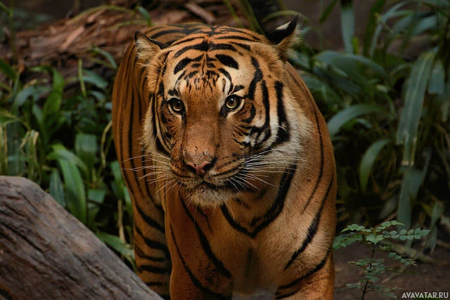 На снимке изображен тигр в его естественной среде обитания, которая, по-видимому, находится в джунглях. Тигр смотрит в камеру сосредоточенным взглядом и окружен растительностью, типичной для леса или дикой природы.