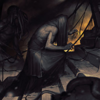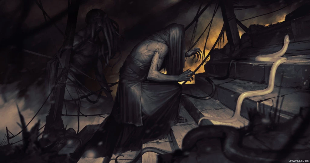 green glow that could imply supernatural forces at play or simply be the result of decay. The artwork is rich in detail and evokes a feeling of post-apocalyptic or Lovecraftian horror, where reality itself seems to have been warped by some unknown force.