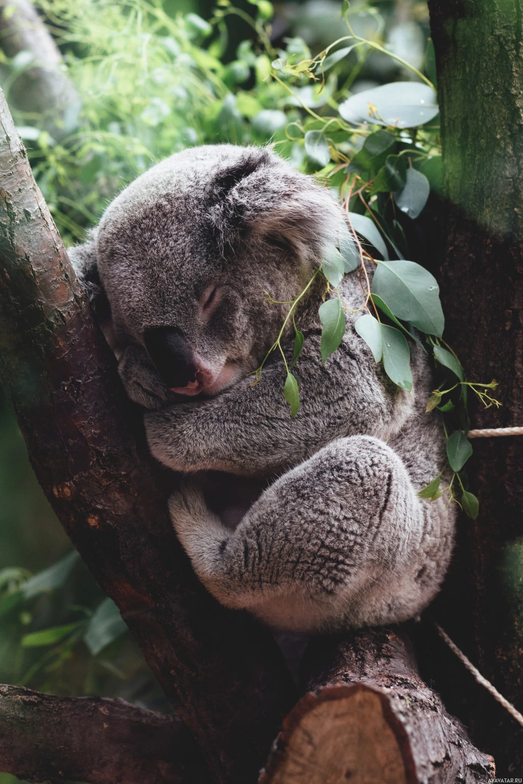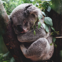 На картине изображен медведь коала, покоящийся на ветвях дерева. По-видимому, он находится в естественной среде обитания, возможно, в заповеднике дикой природы или зоопарке, где он имеет доступ к растительности для кормления и посадки. Коала свернута головой против ветви, предполагая, что она может спать или отдыхать.
