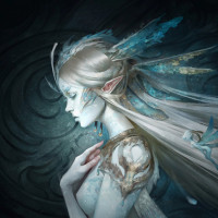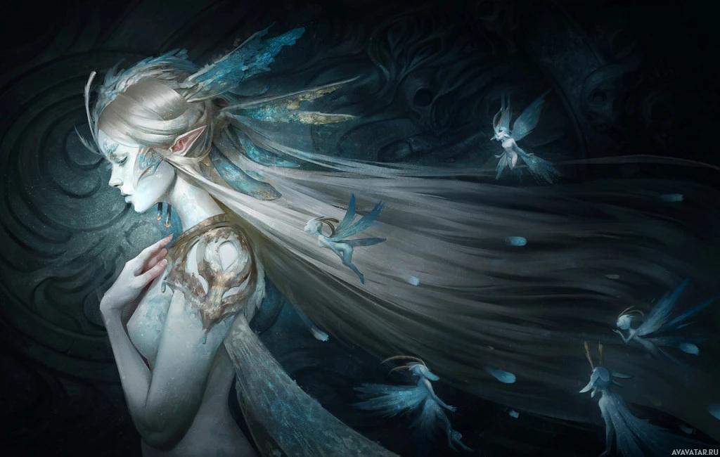 blonde hair and closed eyes, giving the impression of peace or meditation. She is adorned with what appears to be feathers or wings on her back and shoulders, suggesting she may have some sort of magical or ethereal nature. There are also small winged creatures around her, which could be fairies or similar