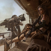 a female character engaged in what appears to be a combat scenario. She is seated on top of a vehicle, which could be an armored personnel carrier or a similar type of military transport, and she's equipped with