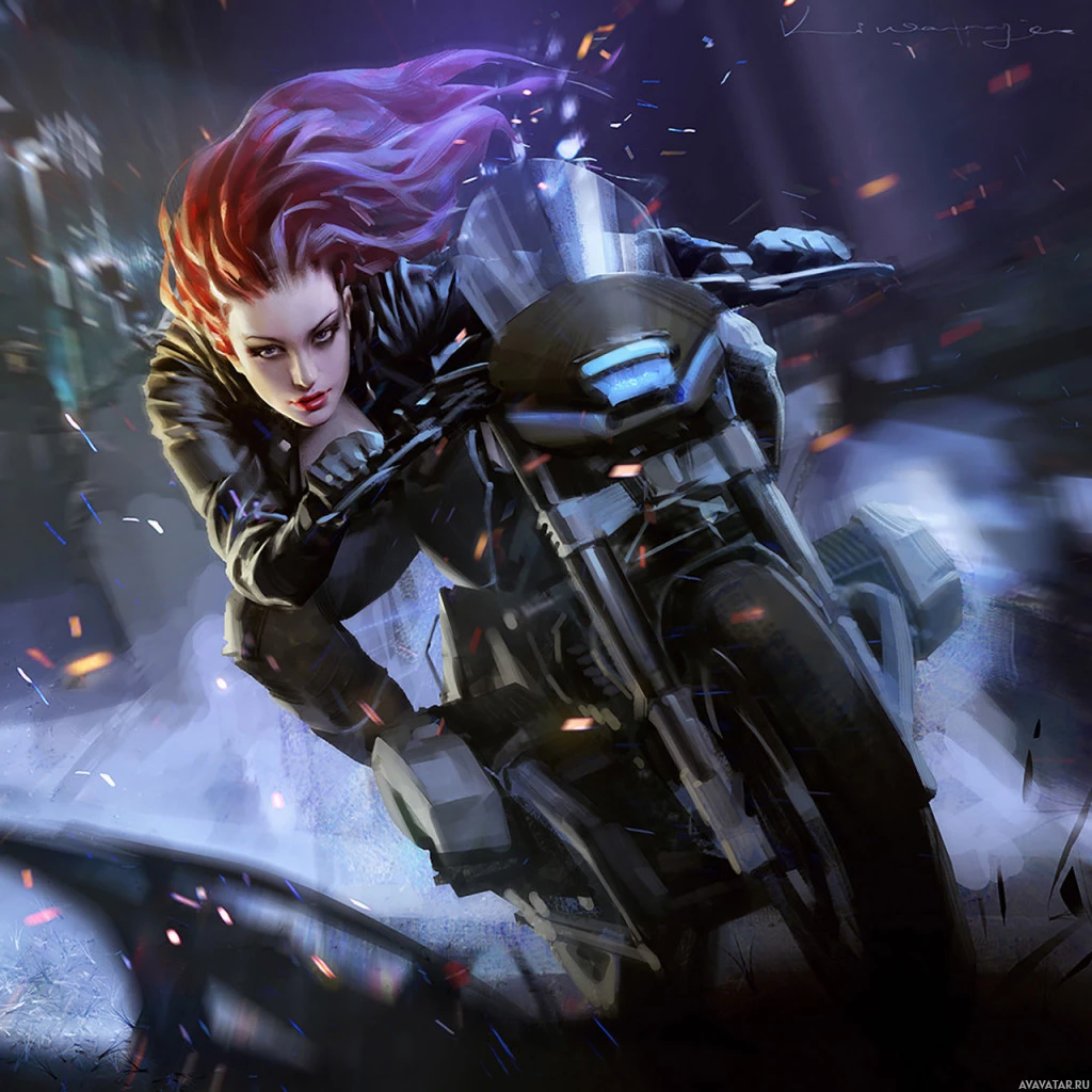 red hair, wearing a leather outfit and a helmet, which is indicative of a biker or a person in an action-oriented role. Her pose suggests motion, possibly indicating that she is in the middle of performing a maneuver or evading something. The setting seems to be at night with dramatic