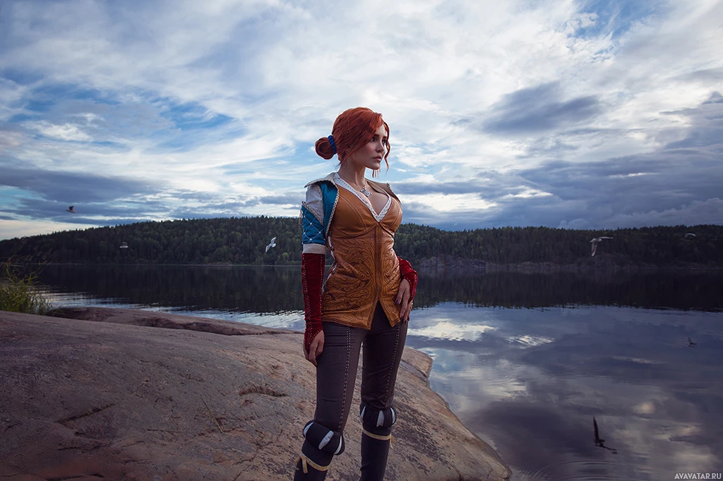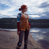 a body of water and a mountainous landscape in the background. The costume includes elements such as armor and clothing that are characteristic of Triss's appearance in the game.