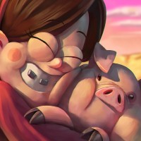 an animated character, a young girl with brown hair, wearing a red hoodie and holding two small piglets. She has