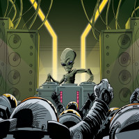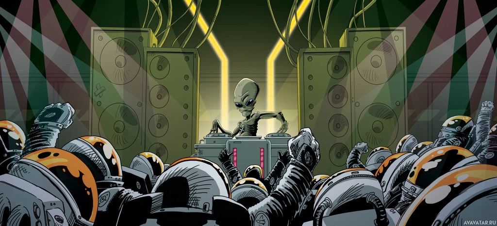 The image depicts a scene where an alien is playing music in front of a crowd. The alien appears to be on stage, surrounded by