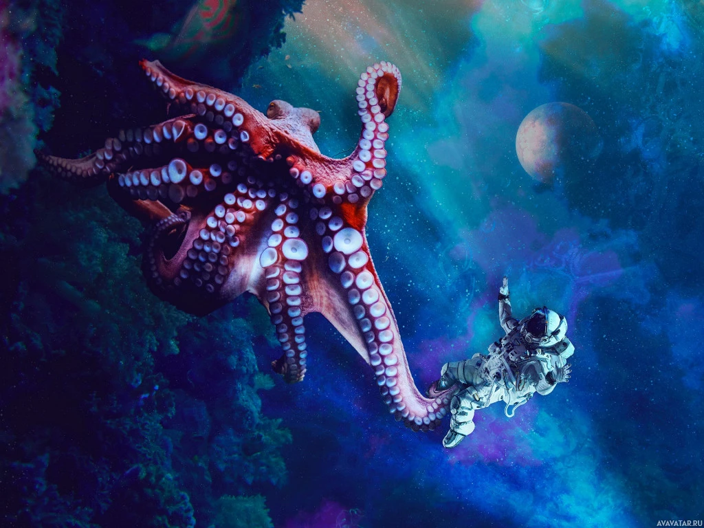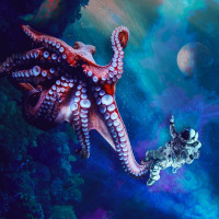 a space environment interacting with two octopuses. This is likely a creative or artistic piece, as it combines elements of human exploration (the astronaut) and