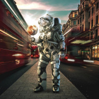 urban environment contrasted with the stillness of the astronaut in the foreground.