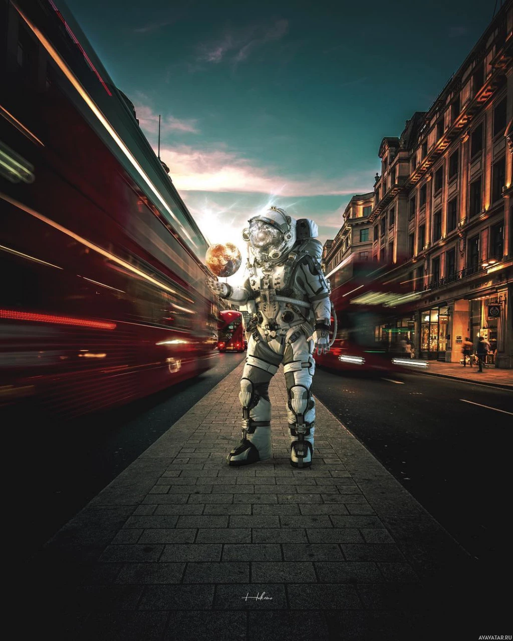 urban traffic. The astronaut is wearing full
