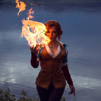 a flaming torch, which is iconic to Triss's abilities in the game. They are standing by