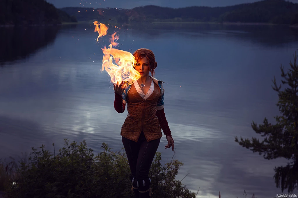 The image shows a person dressed in a costume reminiscent of Triss Merigold from