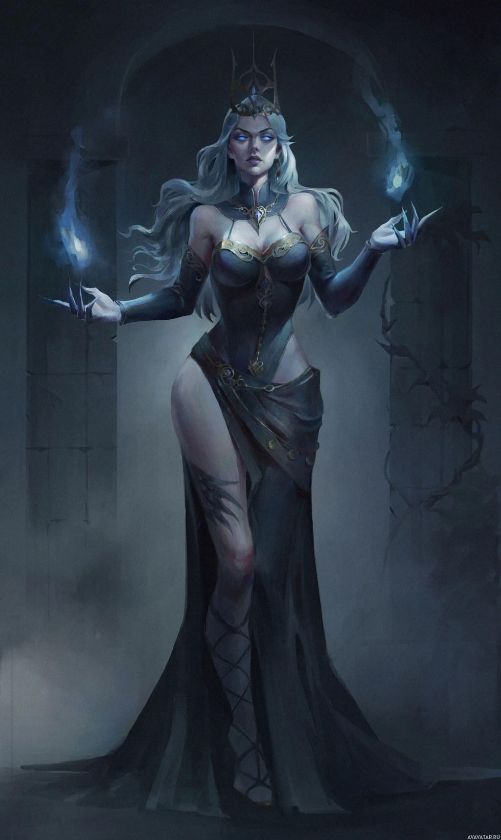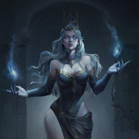 blonde hair, dressed in dark, ornate attire reminiscent of a character from a mythical or magical realm. She is holding what appears to be a wand or staff in her right hand and has