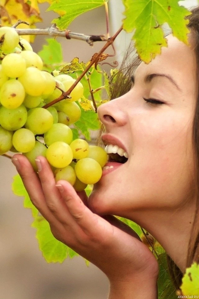 На снимке женщина держит и дегустирует свежий красный виноград. Она окружена зелеными листьями виноградной лозы, что указывает на то, что она, вероятно, находится в винограднике или месте, где выращивается виноград. Основное внимание в картине уделяется тому, чтобы она наслаждалась вкусом фруктов.