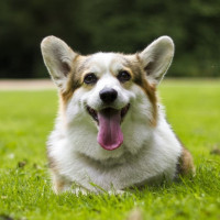 Welsh Corgi dog sitting on grass. It appears to be outdoors, possibly in a park or garden, with trees and greenery around it. The dog is looking directly at the camera, panting slightly with its tongue hanging out of its mouth, which could indicate that it has been playing or exercising.
