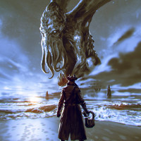 sea creature with tentacles reminiscent of Cthulhu mythos, often associated with the works of H.P. Lovecraft. The setting appears to be nighttime, as indicated by