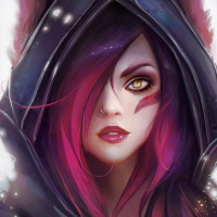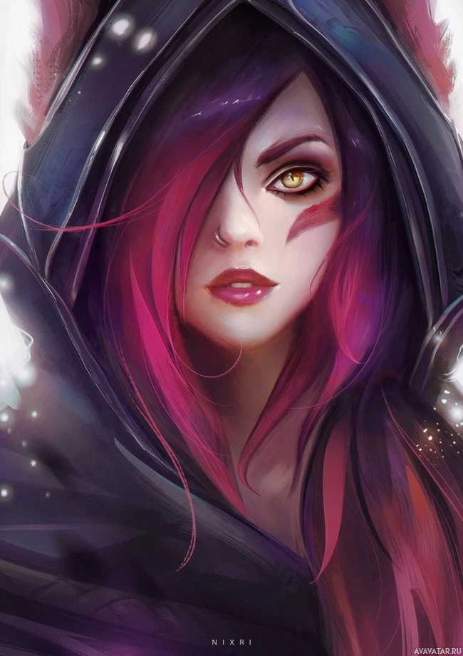 a female character with vibrant red hair styled with bangs and pointed ears, giving her the appearance of a fox-like creature. She is wearing a dark hooded outfit, which could suggest she is portraying a fantasy or superhero type character, possibly associated with a specific group or genre such as those found in