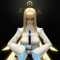 female character with blonde hair and blue eyes. She has an angelic or mystical appearance, wearing an outfit that could be interpreted as armor or attire for someone of