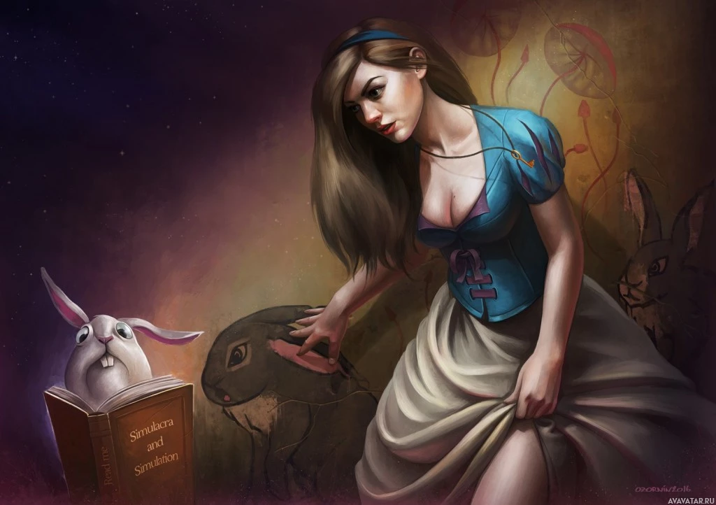 long hair who appears to be in a fantasy or fairy tale setting. She's holding a book open, and there's a rabbit sitting at her feet, seemingly listening to the story. The background has an ethereal quality with swirling patterns and hints of