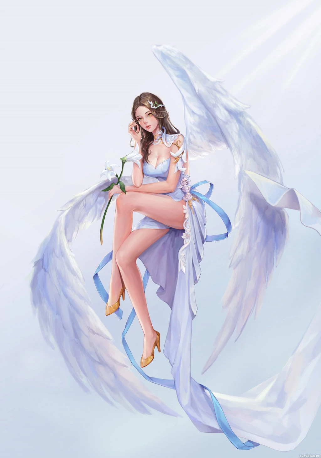 The image depicts a fantasy-themed illustration of an angel. The central figure is
