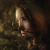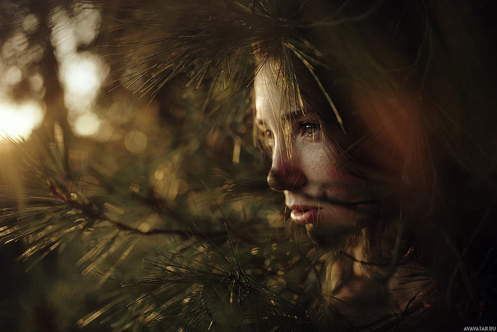 На картинке изображена молодая женщина, которая пристально смотрит вдаль. Она, кажется, находится в естественной обстановке с деревьями и, возможно, подрастает вокруг нее. Освещение предполагает, что это может быть восход солнца или закат, учитывая теплые тона на лице человека.