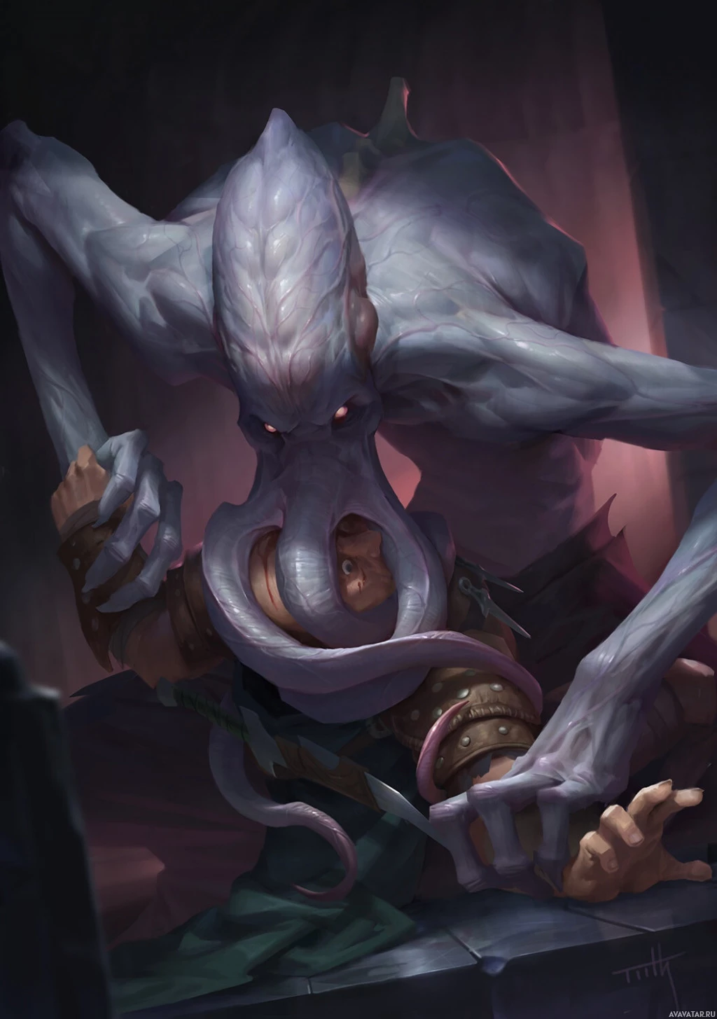 a fantasy scene with two monsters. One is humanoid, standing over the other which appears to be a large octopus or cephalopod with multiple tentacles and