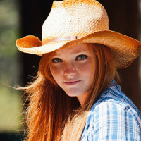 The picture features a red-haired girl wearing a cowboy hat. She is looking directly at the camera with a neutral expression. In the background, there appears to be a rustic setting that could suggest a rural or outdoor environment.