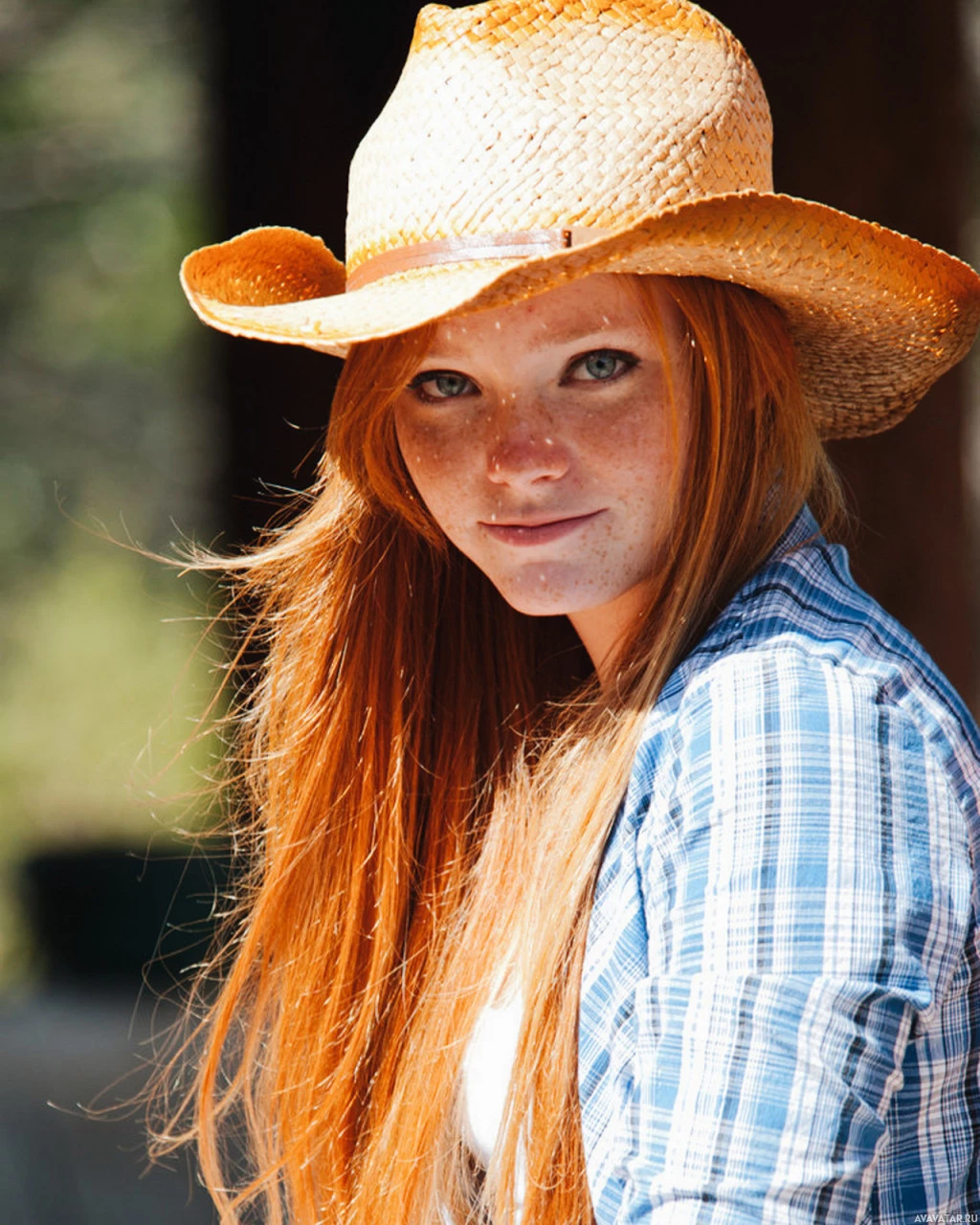 На картине изображена рыжеволосая девушка в ковбойской шляпе. Она смотрит прямо в камеру с нейтральным выражением лица. На заднем плане, похоже, есть деревенская обстановка, которая может указывать на сельскую или наружную среду.