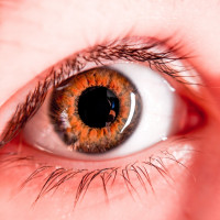 The image shows a close-up of a person's eye looking upwards, with the iris and pupil clearly visible. It appears to be a detailed photograph of