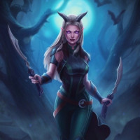 a dark forest-like setting with a moonlit sky above. The character's pose suggests she might be in