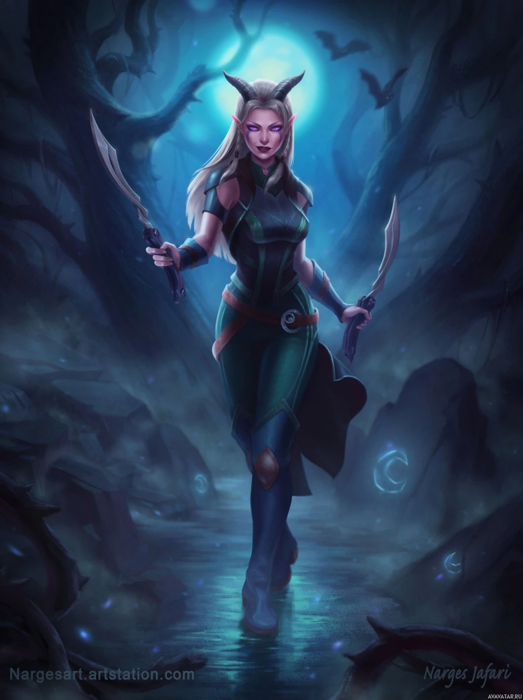 a character from the game "Warcraft," who appears to be a female draenei. She is holding two swords, one in each hand, and is wearing armor that includes a helmet with ears and a cape. She is walking through