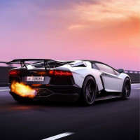 rear wing and the distinctive doors that open upwards. There are visible flames coming from the tailpipes of the vehicle, which suggests it might be a stylized effect for an advertisement or