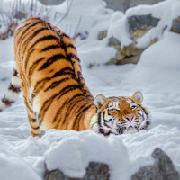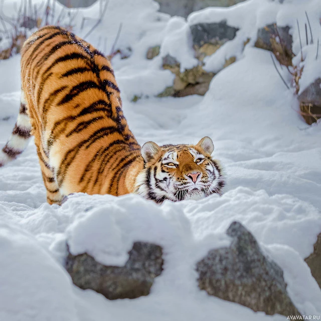 На снимке изображен тигр в снегу. Судя по его расслабленной позе и тому, что он частично зарыт в снег, он либо отдыхает, либо играет. Тигр стоит лицом к камере, и часть его тела видна над снежной поверхностью, в то время как другая часть его тела скрыта под белым снегом.